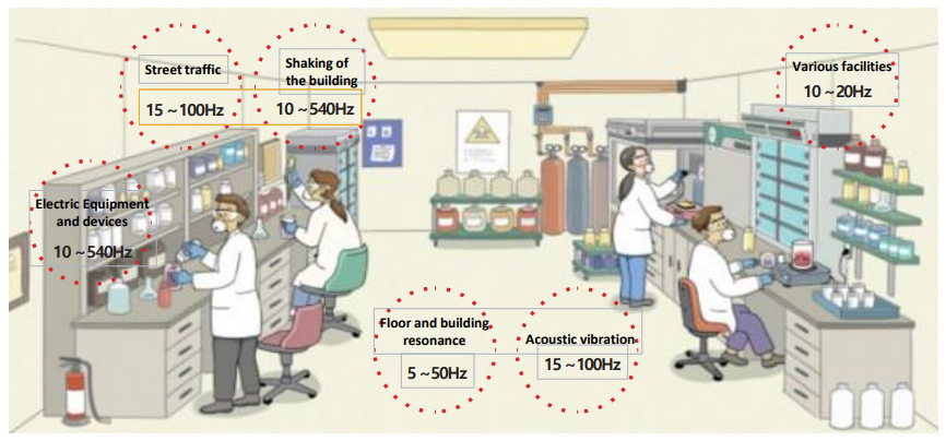 Vibration criteria used in the industrial field utilizes a lot of “BBN Criteria” or “VC Curves". In particular, the curve below is used as a standard for precise experimentation, analysis, measurement and construction of a sensitive semiconductor facility environment (floor construction, piping, ventilation system). BBN Criteria and VC Curves are the same curve, but VC Curves is a more recently improved curve and provides a standard that can respond to micro- vibration control technology.